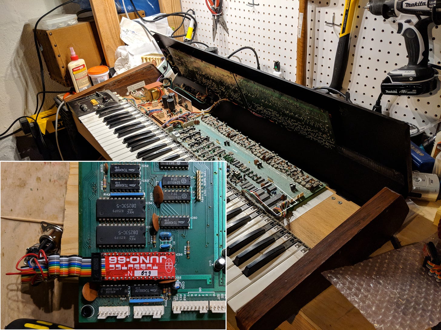 The filtered Juno tone run through distortion is nasty in the best way possible. This is run through the Third Man Hardware Triple Threat pedal with distortion and delay on. If you haven’t heard of these, they are nice budget-friendly pedals made by Donner under direction of Jack White. I won’t get off-task and gush too much about the Triple Threat here, but it’s worth acknowledging that I’ve been happier with this $100 3-pedal combo than most other combinations of 3 application-specific pedals.