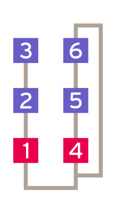 Pulling from my experience with the Juno, I knew starting simple was going to yield better results than immediately incorporating every feature of the synth. One of the cool features of FM synthesis is that you choose how the signal generators connect (also called the algorithm). I was able to find an algorithm that had some similarities to the 303 signal chain (Fig 3). This one lets me use operator 1 and 4 as square and sawtooth waveform generators, respectively, which can then be modulated by the other operators if needed. I am not going to worry too much about modulating with 2-3 and 5-6 because that type of synthesis is not very 303 and goes against my newly found guideline of keeping the waveforms simple when emulating a 303.